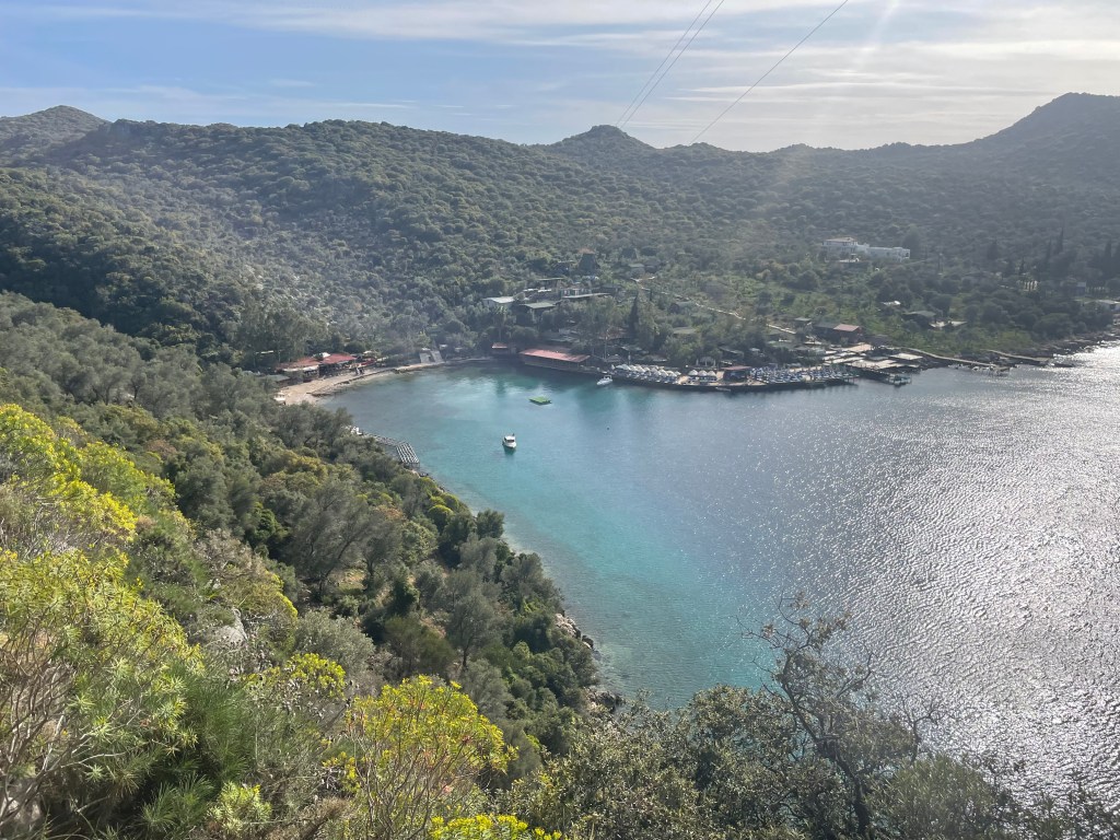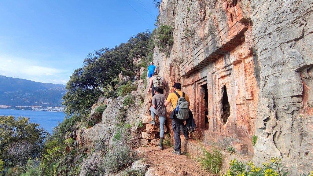 We wound our way through valleys and fields, following the famous Lycian Way. Sometimes we’d stop at a tree to enjoy its fruit or leaves. At one point, we were sure we’d gotten lost, as we scrambled through spiky bushes along a cliff side. However, we were assured we weren’t lost, just looking for a landmark that we never seemed to find. We finally arrived at Limanağzi Beach, which is only accessible by boat or hiking. We chatted for a while with the couple about travel and Turkish politics, learning a lot about the political climate and upcoming elections. After enjoying our packed lunches of sandwiches, burek, sarma, and coffee, Liam and I took a swim in the chilly water. Every time I swim here, I’m amazed by the clear, turquoise water, and this was no exception. After our swim, we continued the hike back to Kaş, passing by some ancient Lycian tombs on the way. We made it back to the hostel that evening very tired after clocking 15 miles of walking that day.